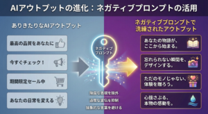 優れたアウトプットは、優れたポジティブプロンプトとネガティブプロンプトの組み合わせによって生まれます。「何を作り上げたいか」という明確なビジョン(ポジティブ)と、「何を避けたいか」という明確な制約(ネガティブ)の両方をAIに与えることで、初めて創造性は正しい方向へと導かれます。