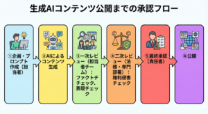 - 生成物の権利確認と帰属: 生成されたコンテンツの著作権が誰に帰属するのか、商用利用が可能かを確認する手順を定めます。