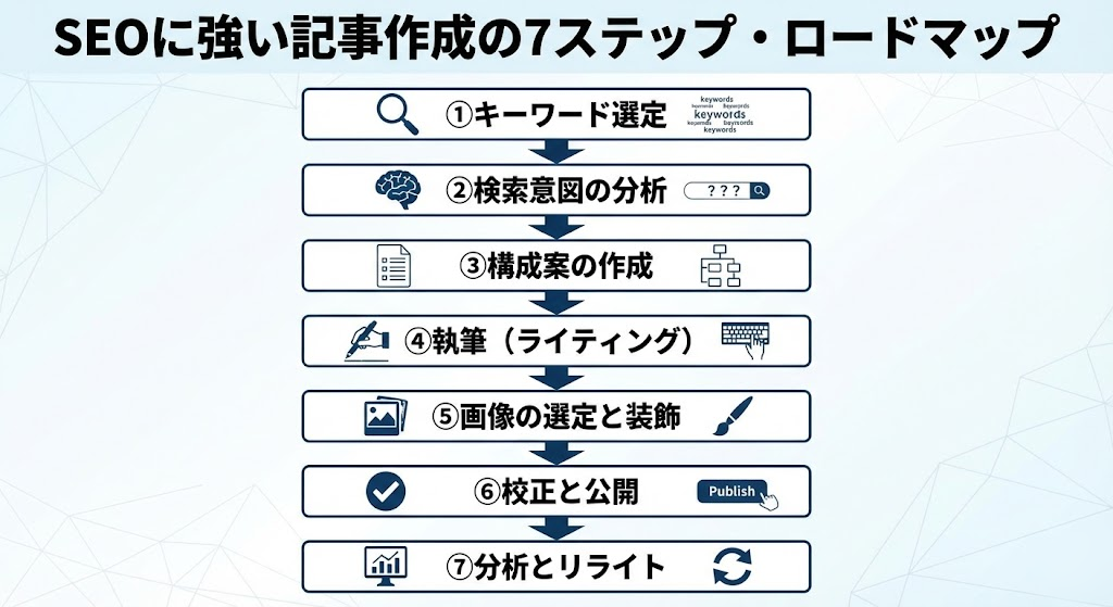 本章では、マーケティング初心者の方でも迷うことなく、ゴールに向かって進めるように、記事作成の全体像を「7つのステップ」に分解して解説します。